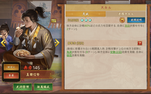 そしてこれは引換券で手に入れたんだけど真田信繫、この武将も評価非常に高くてお宮前田まつ以上の回復要員+激励までしてくれる超優れ武将。